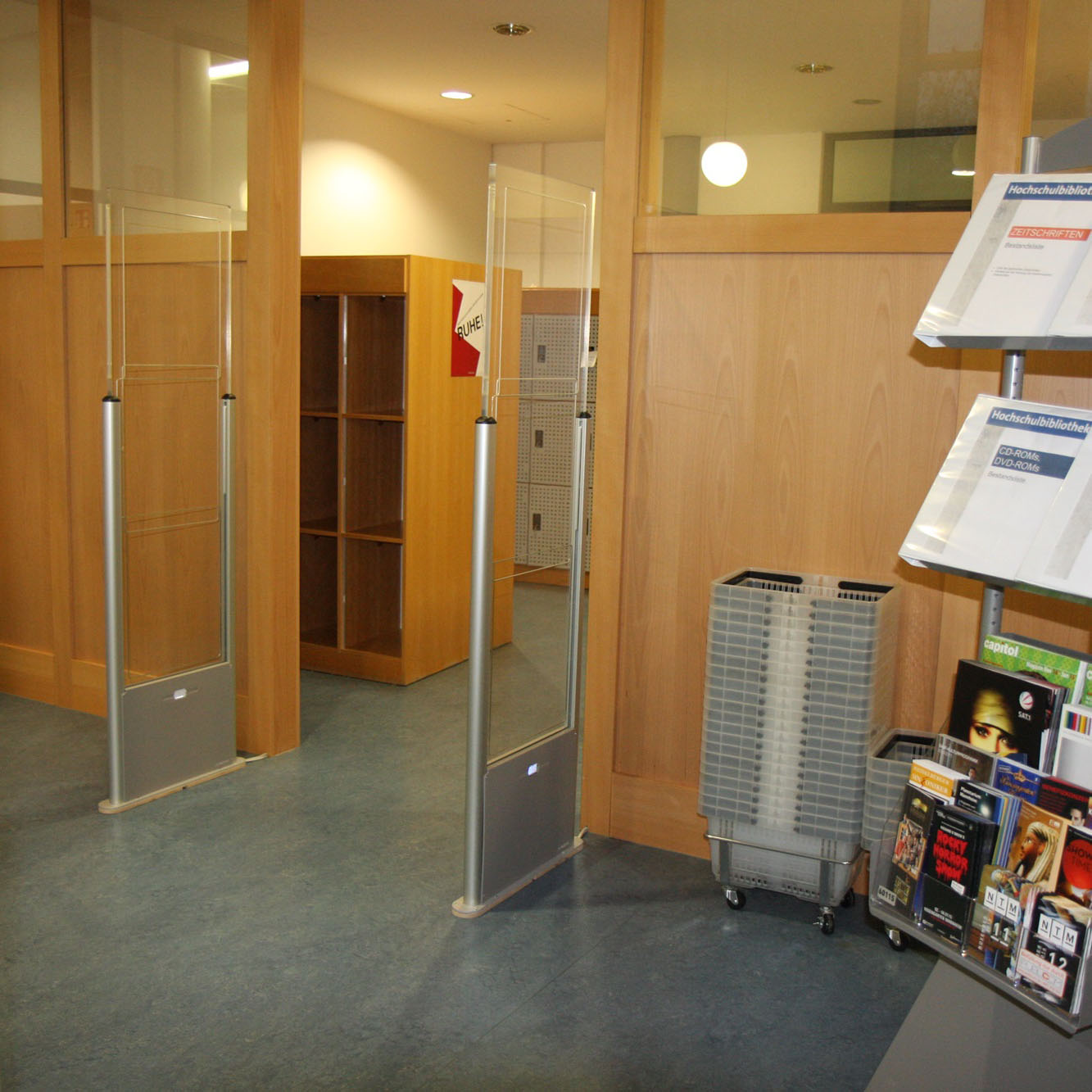Eine dezentes, man möchte fast sagen elegantes Glas-Gate flankiert den Eingang zur Bibliothek im ersten Stock des Gebäudes L. Durch sie betritt man einen hellen, freundlichen Bibliotheksraum, der zum Arbeiten einlädt. Jetzt, um halb zwei Mittags mitten in der Prüfungszeit, ist es hier ruhig und nur wenige Besucher lassen sich blicken. Frau Klein, die mich schon erwartet, verrät mir aber, dass das keineswegs der Dauerzustand ist. In den 10 Monaten von März 2015 bis zum Ende des Jahres hatte die Bibliothek 90.000 Besucher. Im Schnitt sind das 50 Besucher pro Stunde während der Öffnungszeit. Sie weiß das deswegen so genau, weil die Schranke nicht nur verhindert, dass nicht ausgeliehene Bücher die Bibliothek verlassen, sondern auch die Besucher zählt. Ihr PC hat eine Schnittstelle zum Gate – wenn Sie möchte kann sie sich für jeden Tag eine stundenweise Statistik erstellen lassen. „Selbstverständlich hatten wir auch vorher Erfahrungswerte, wann besonders viel los ist und dementsprechend die Ausleihe besetzt. Mit der Statistik geht das aber viel einfacher und passgenauer. Damit sind auch viel mehr Kapazitäten für die Buchbearbeitung und v.a. kompetente Beratung der Benutzer frei.“