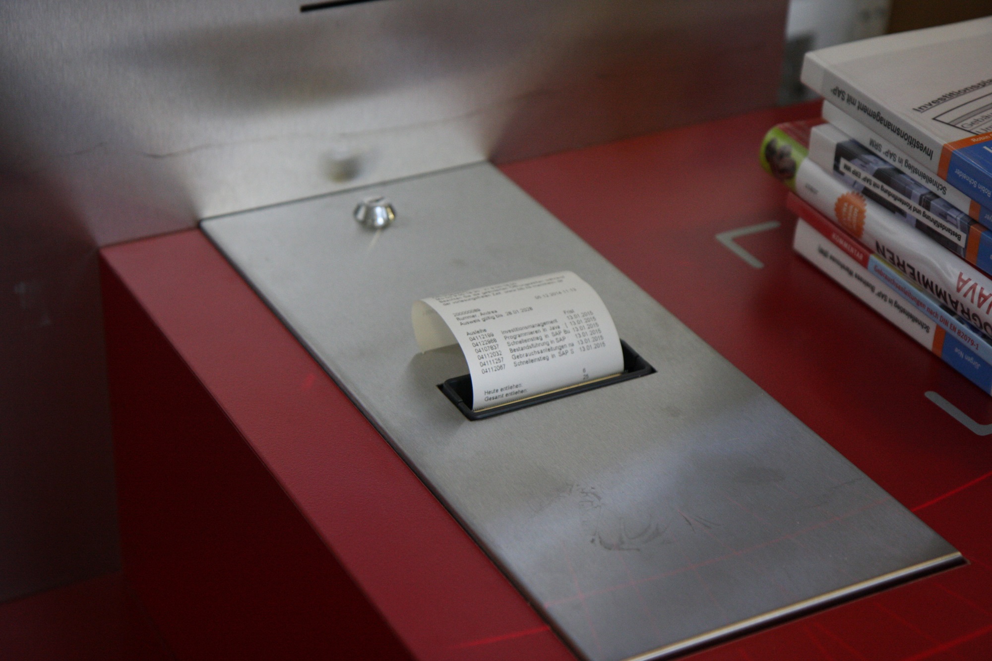 Die großen Vorteile des Systems erschließen sich mir sofort als wir mit fünf Büchern zur Ausleihe gehen. Die Bibliothekarin liest den Nutzerausweis ein, keine Sekunde später erscheinen darunter, wie von Zauberhand, die fünf Titel. Einen Klick später sind sie als ausgeliehen verbucht. Erstaunt erinnere ich mich an meine Studentenzeit, als jedes Buch noch einzeln an der richtigen Stelle aufgeschlagen und eingescannt werden wollte und bin beeindruckt. Frau Klein zeigt mir vier unauffällige Klebepunkte auf dem Tisch, die ein Rechteck bilden. Unter dieser Stelle der Tischplatte sitzt das Lesegerät, das die Frequenz des Chips ausliest und an das Buchungssystem weiterleitet. Bis zu fünf Titel können so im Stapel verarbeitet werden. „Das sorgt für kleinere Warteschlangen und entlastet das Bibliothekspersonal auch physisch – Bücher sind schwer. Jetzt müssen sie nicht mehr einzeln hoch gehoben und aufgeschlagen werden. Darüber hinaus werden nicht mehr so viele Kapazitäten durch reine Routinearbeit gebunden, sondern sind frei für qualifizierte Aufgaben, wie die Beratung der Benutzer und die Buchbearbeitung.“ Nicht zuletzt deswegen wurde das neue System von den MitarbeiterInnen, deren Belastung durch die steigende Anzahl der Entleihungen in den Jahren davor angewachsen war, problemloser akzeptiert als erwartet. Klein gibt zu, dass sie hier Bedenken hatte, der eine oder andere könne das Gefühl haben, die Technik nehme ihm Arbeit weg.