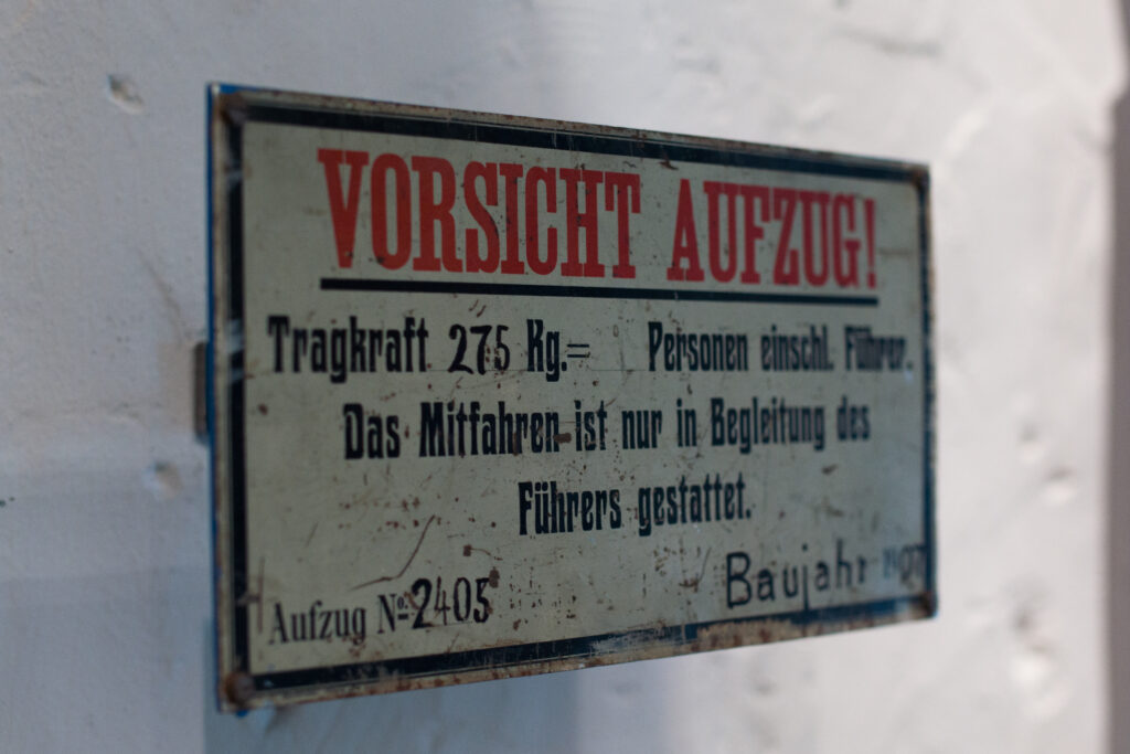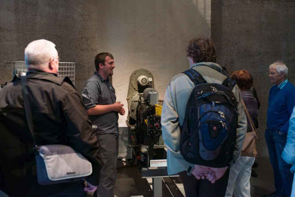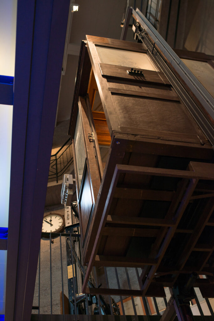 Bei der anschließenden Führung gab es dann neben den erwarteten Higlights, wie den voll funktionsfähigen Pater Noster und den Odenwälder Mühlenaufzug, einiges zu entdecken und zu »erhören«. Denn (fast) alle Aufzüge, Maschinen etc., die bei Lochbühlers ausgestellt sind, funktionieren auch und demonstrieren z.B., dass das leise Surren eines heute gebauten hydraulischen Aufzugs Ergebnis eines langen Entwicklungsprozess war. Und auch die Funktionsweise von Fangvorrichtungen wird am »laufenden Objekt« eindrücklich demonstriert.