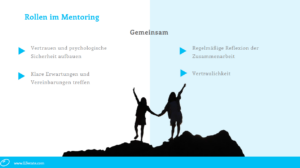 Neben den Zielen von und Rollen im Mentoring ging es um gegenseitige Erwartungen und Kommunikation sowie um die Gestaltung des Mentoringprozesses von der Start- und anschließenden Arbeitsphase über die Zwischenbilanz bis zum Abschluss. Auch die Toolbox kam nicht zu kurz und die wichtige Empfehlung, auf das eigene Netzwerk zurückzugreifen (evtl. Uli oder Ulrike aus Team xy?), wenn Mentor oder Mentorin mal nicht direkt eine Antwort parat haben.