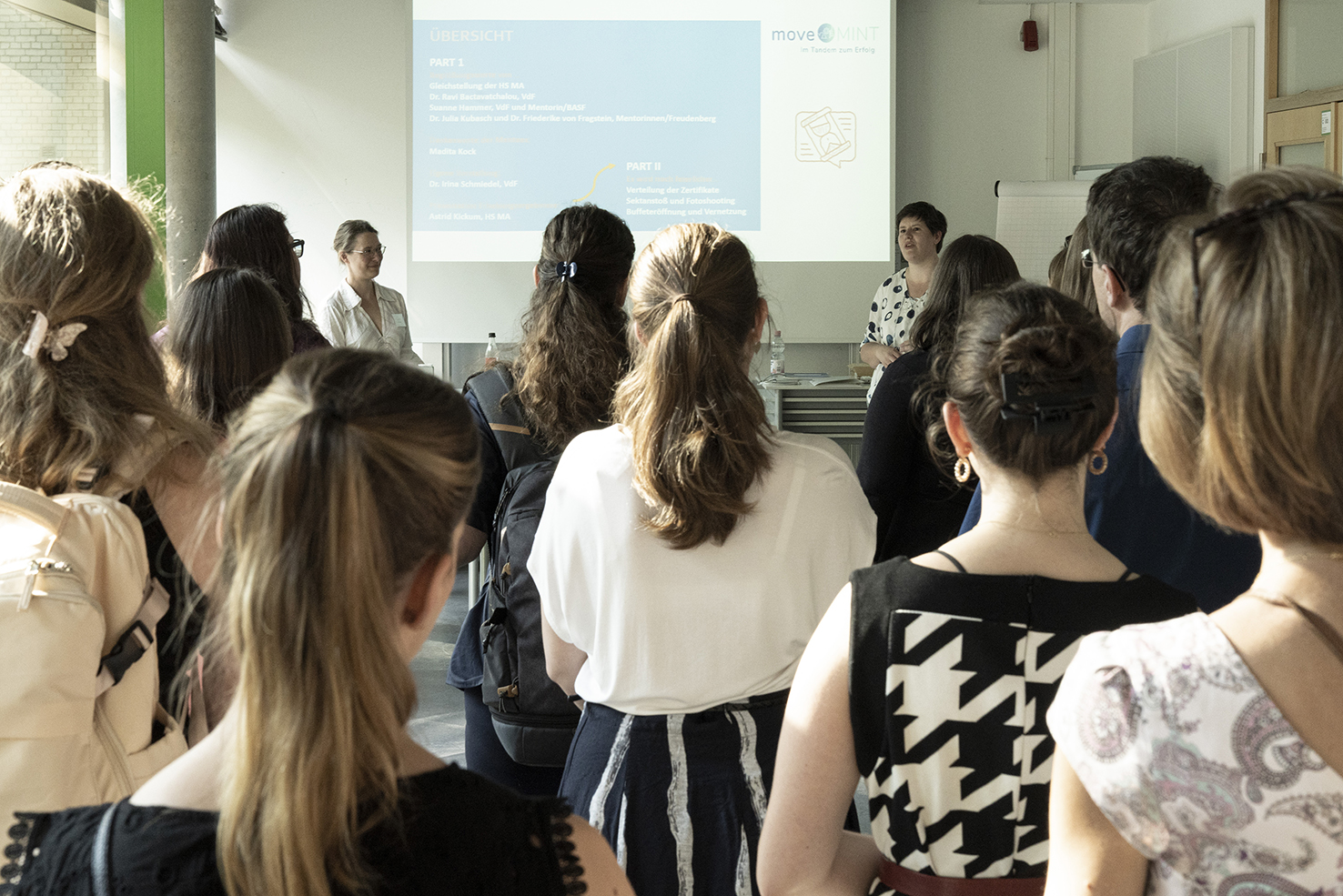 Angebote zur Vernetzung der Mentees und Mentor:innen untereinander sowie ein umfassendes Rahmenprogramm mit Impulsveranstaltungen zu Themen wie Bewerbung und persönlichen Stärken, Finanzvorsorge und Digital Networking ergänzten das individuelle Mentoring in den Tandems und Teams. „Über all diese Themen zu sprechen, herauszufinden und zu kommunizieren, was man wirklich möchte, ein Netzwerk aufzubauen und zu pflegen, ist überaus wichtig.“, sagt Susanne Hammer, Mentorin und Vizepräsidentin des VdF. Und Regina Reul, bereits zum zweiten Mal als moveMINT-Mentorin dabei, bekräftigt: „Ich hätte mir ein ähnliches Angebot als Studentin gewünscht und sehe, dass die jungen Frauen sehr von dem Austausch profitieren. Auch als Mentorin gewinne ich interessante Impulse und neue Blickwinkel.“