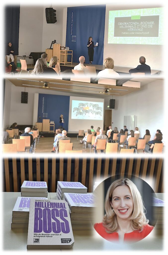 Als Speakerinnen gaben uns Swenja Thaumüller und Madeleine Kühne pointierte Hintergrundinfos, wie es (doch) klappen könnte zwischen den Boomern und der GenY, der Generation Golf und der GenZ. Die Impulse wurden – moderiert von StefanieKeusch – im Anschluss nochmals genauer unter die Lupe genommen, ergänzt, beleuchtet, diskutiert… Aus der eigenen (Alters-)Blase zu gehen, sich in aller Unterschiedlichkeit und Ähnlichkeit anzunähern und einander zuzuhören, ist der erste Schritt für eine Kooperation, die ein enorm großes win-win-Potenzial in sich trägt – auch, aber nicht nur an der Hochschule Mannheim